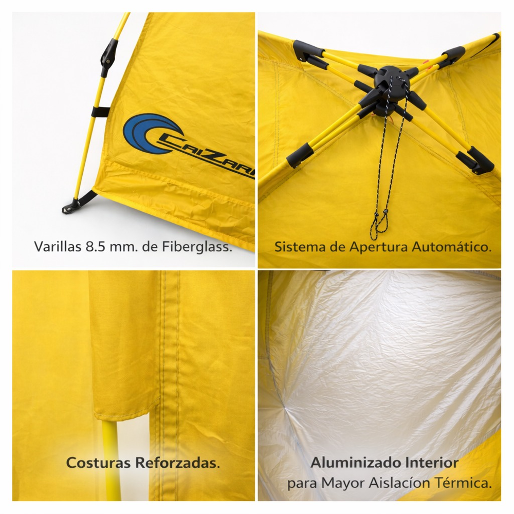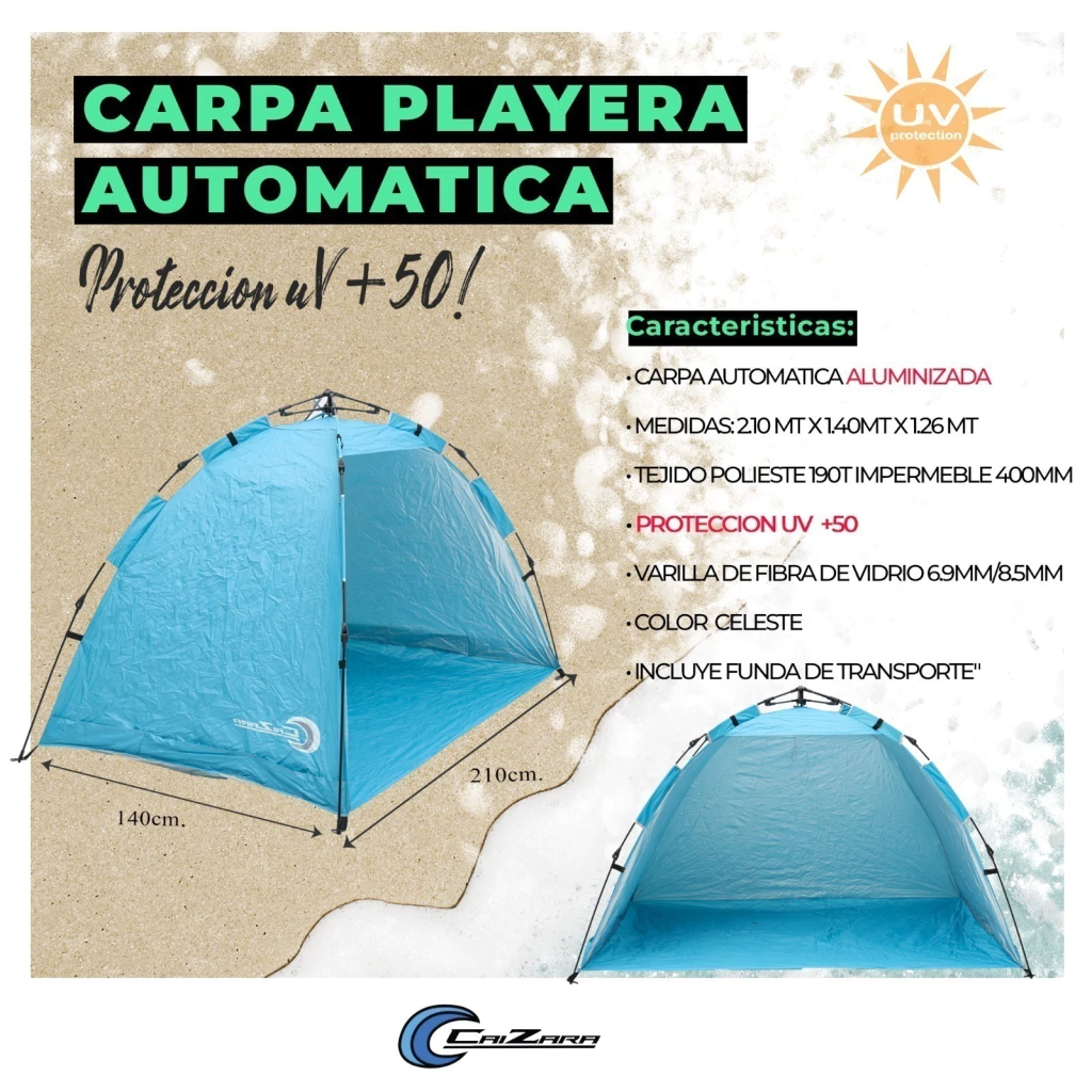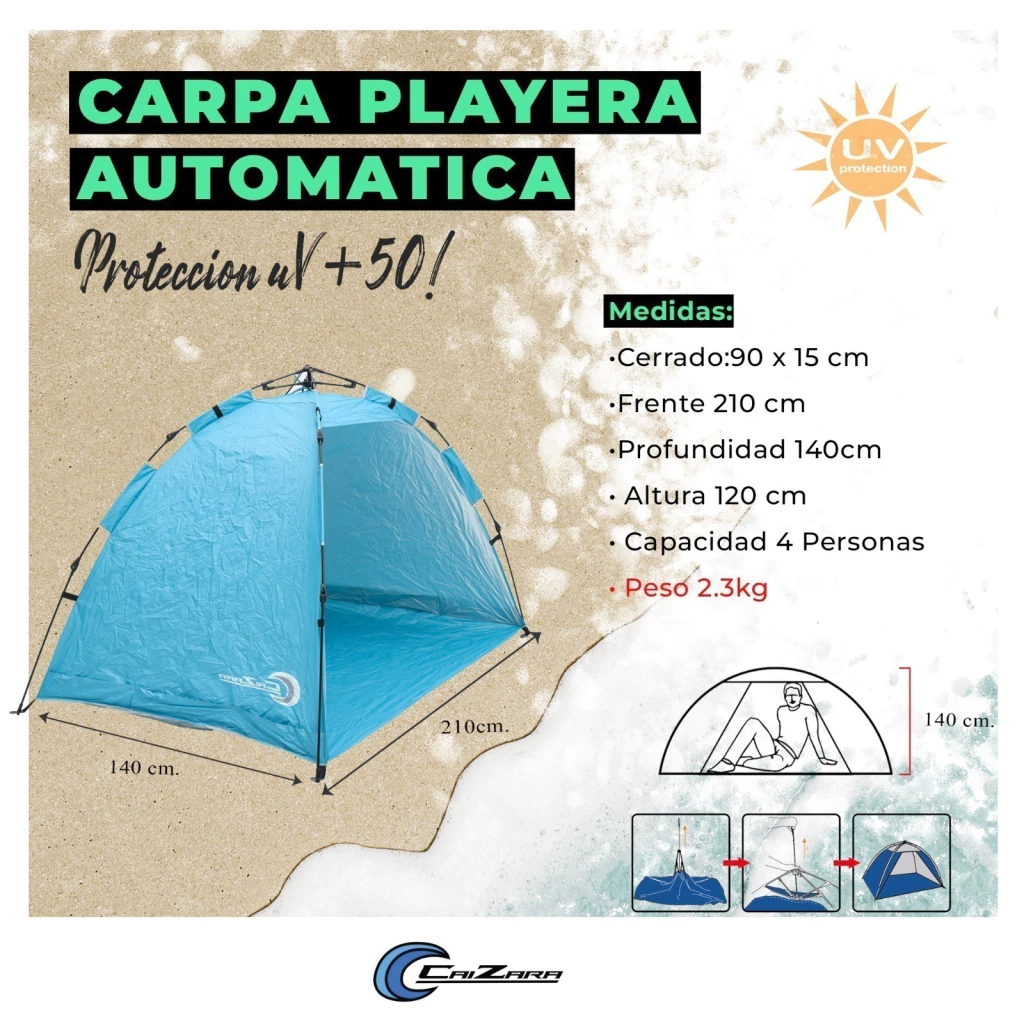 Características del Producto Armado Automático en 3 Segundos: Simplifica tus jornadas, ¡monta tu carpa en un instante! Capacidad: Espacio para hasta 4 personas, perfecta para compartir con familia y amigos. Medidas: Abierta: 210 cm x 140 cm x 126 cm Cerrada: 90 cm x 15 cm Material Resistente: Confeccionada en poliéster 190T, impermeable hasta 400mm, asegurando que te mantendrás seco en todo momento. Protección UV +50: Su diseño aluminizado proporciona la protección necesaria contra los dañinos rayos solares. Estructura Duradera: Varillas de fibra de vidrio de 69mm/85mm que garantizan estabilidad y resistencia. Color Atractivo: Disponible en un fresco tono celeste que destaca en la playa. Transporte Sencillo: Incluye una práctica funda de transporte para facilitar su traslado. Dimensiones y Peso Peso: Solo 2.3 kg, liviana y fácil de manejar. La Carpa Playera Automática Aluminizada Caizara es la opción ideal para disfrutar del verano en la playa. No dejes pasar la oportunidad de tenerla y asegúrate de disfrutar de tus días al aire libre con la mejor protección.