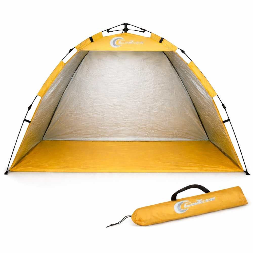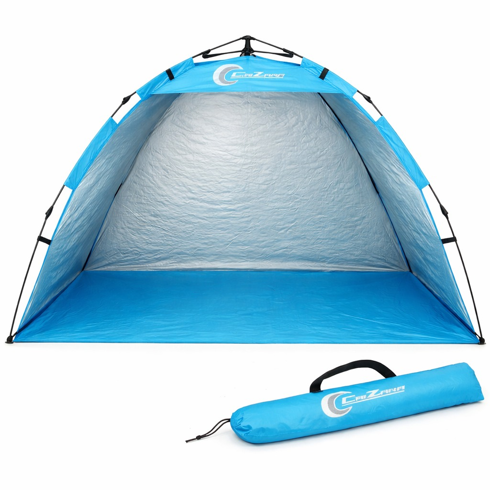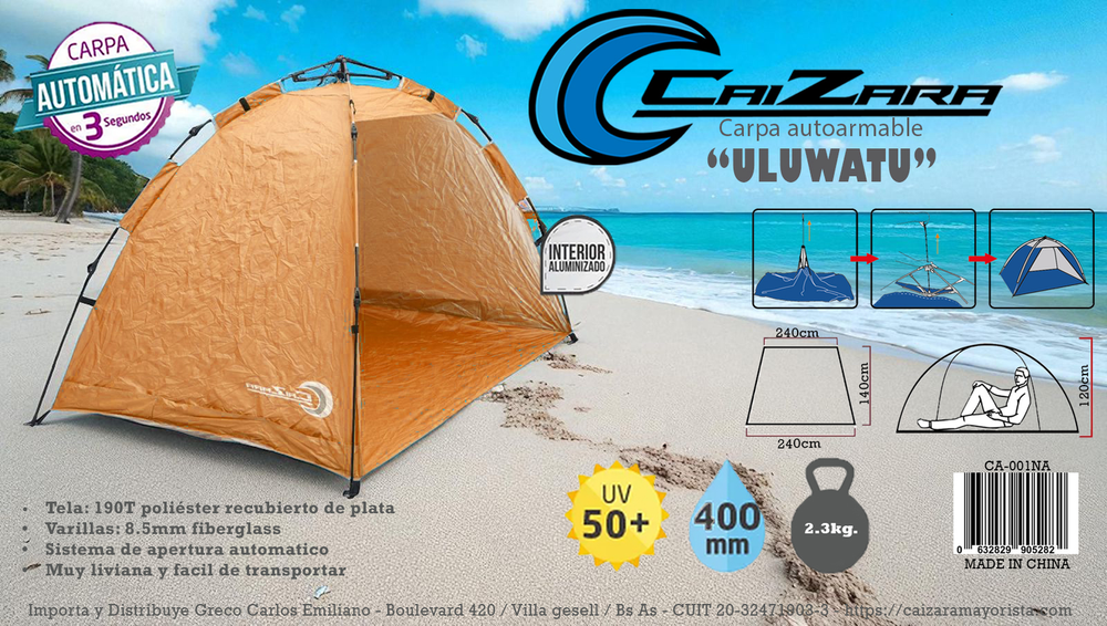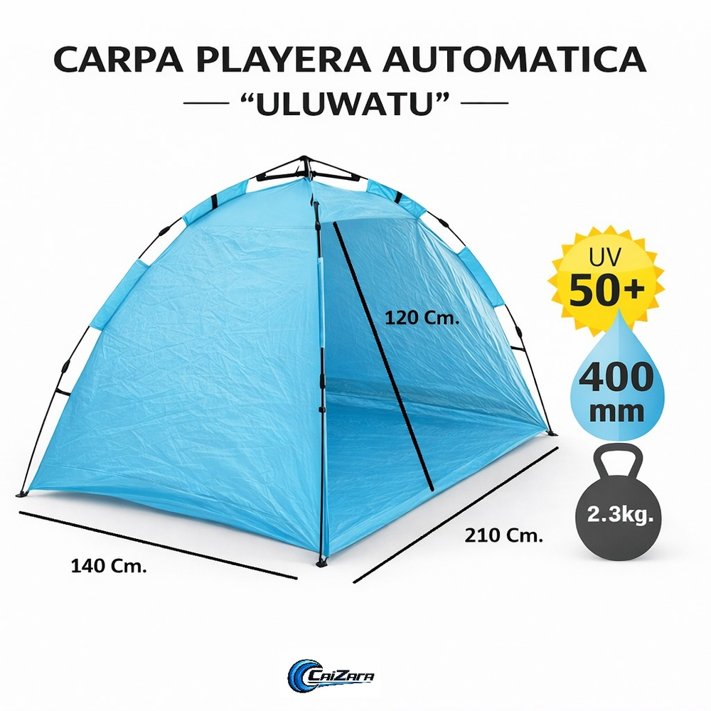 Características del Producto Armado Automático en 3 Segundos: Simplifica tus jornadas, ¡monta tu carpa en un instante! Capacidad: Espacio para hasta 4 personas, perfecta para compartir con familia y amigos. Medidas: Abierta: 210 cm x 140 cm x 126 cm Cerrada: 90 cm x 15 cm Material Resistente: Confeccionada en poliéster 190T, impermeable hasta 400mm, asegurando que te mantendrás seco en todo momento. Protección UV +50: Su diseño aluminizado proporciona la protección necesaria contra los dañinos rayos solares. Estructura Duradera: Varillas de fibra de vidrio de 69mm/85mm que garantizan estabilidad y resistencia. Color Atractivo: Disponible en un fresco tono celeste que destaca en la playa. Transporte Sencillo: Incluye una práctica funda de transporte para facilitar su traslado. Dimensiones y Peso Peso: Solo 2.3 kg, liviana y fácil de manejar. La Carpa Playera Automática Aluminizada Caizara es la opción ideal para disfrutar del verano en la playa. No dejes pasar la oportunidad de tenerla y asegúrate de disfrutar de tus días al aire libre con la mejor protección.