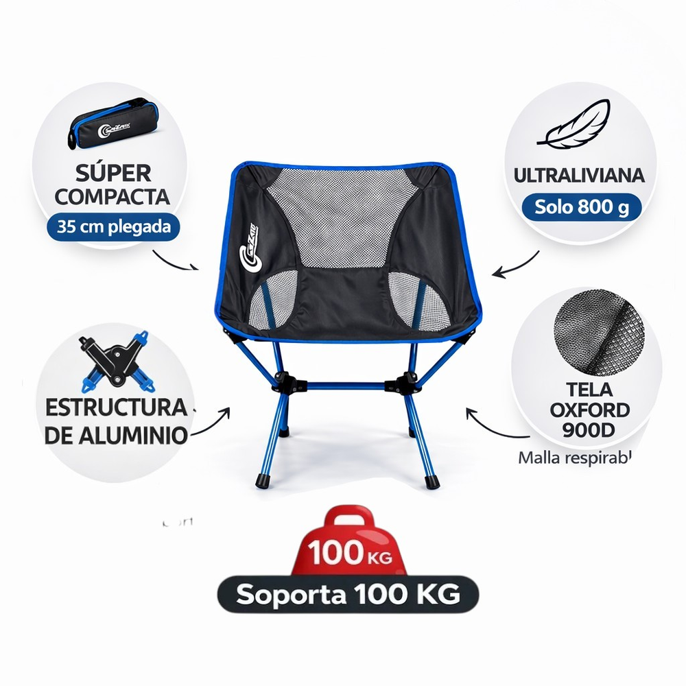 Un sillón liviano, práctico y fácil de llevar, pensado para acompañarte en cada aventura.