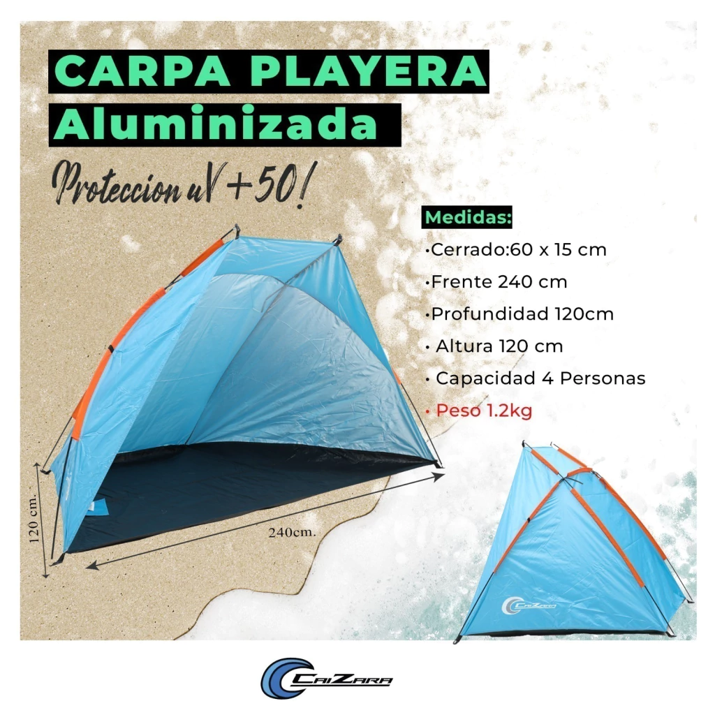 CARPA PLAYERA FILTRO Uv PLAYA • Modo de Uso: Carpa Playera con Acceso Frontal • Tipo de armado y desarme: Armado manual • Material: 190T Poliester revestido aluminazado • Medidas: 240 ancho x 120 alto x 120 prof • Peso: 1.3 Kg • Resistencia a Rayos UV • Capacidad: 2 • Bolso de Transporte