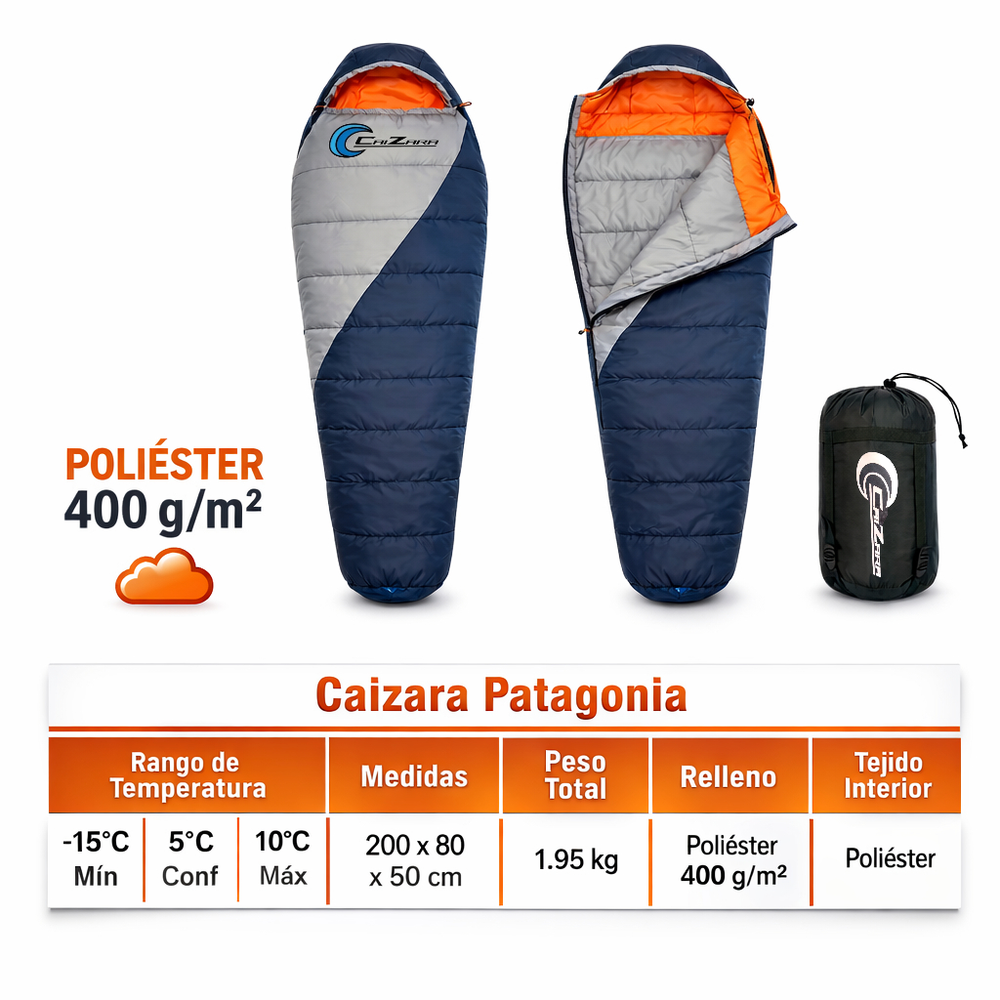 Descubre la Bolsa de Dormir Caizara Patagonia, diseñada especialmente para tus aventuras en climas fríos. Con una capacidad para resistir temperaturas de hasta -15 grados, esta bolsa es perfecta para camping, excursiones y viajes en invierno.