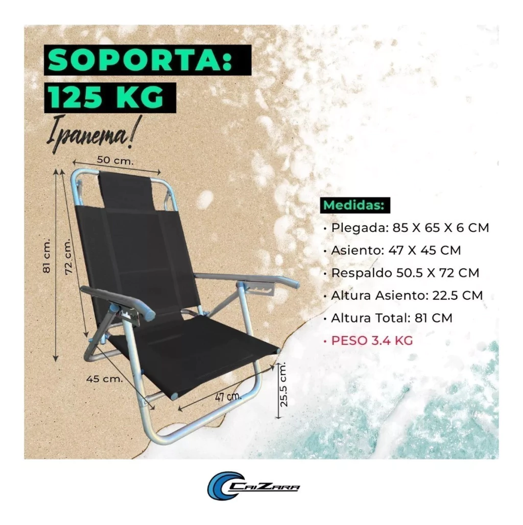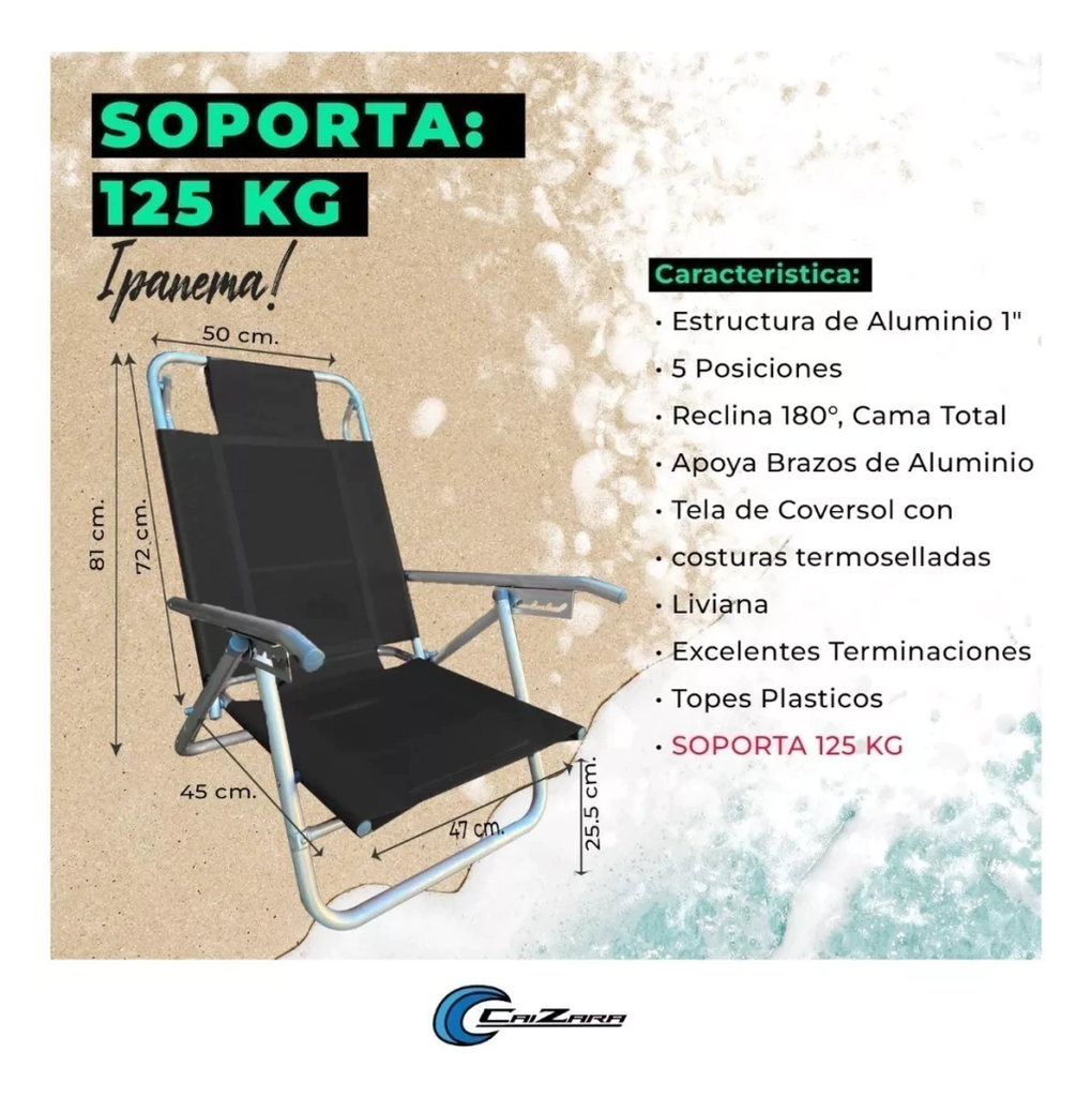 Características Principales: • MUY REFORZADA 125 KG • Estructura íntegramente de Aluminio 1" • 5 Posiciones • Reclina 180°, Cama Total • Apoya Brazos de Aluminio • Tela de Coversol • Liviana • Dura Muchísimos Años • Excelentes Terminaciones • Calidad Superior • Peso Máximo: 125 KG