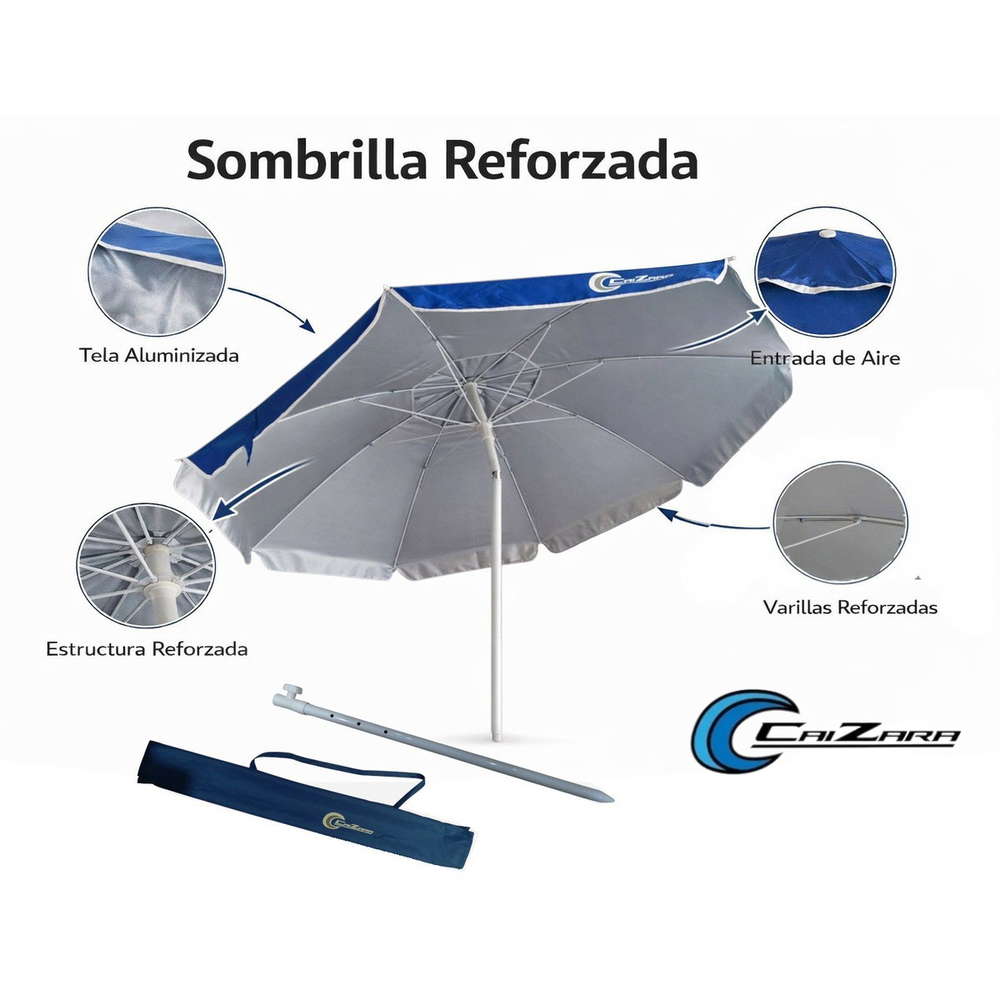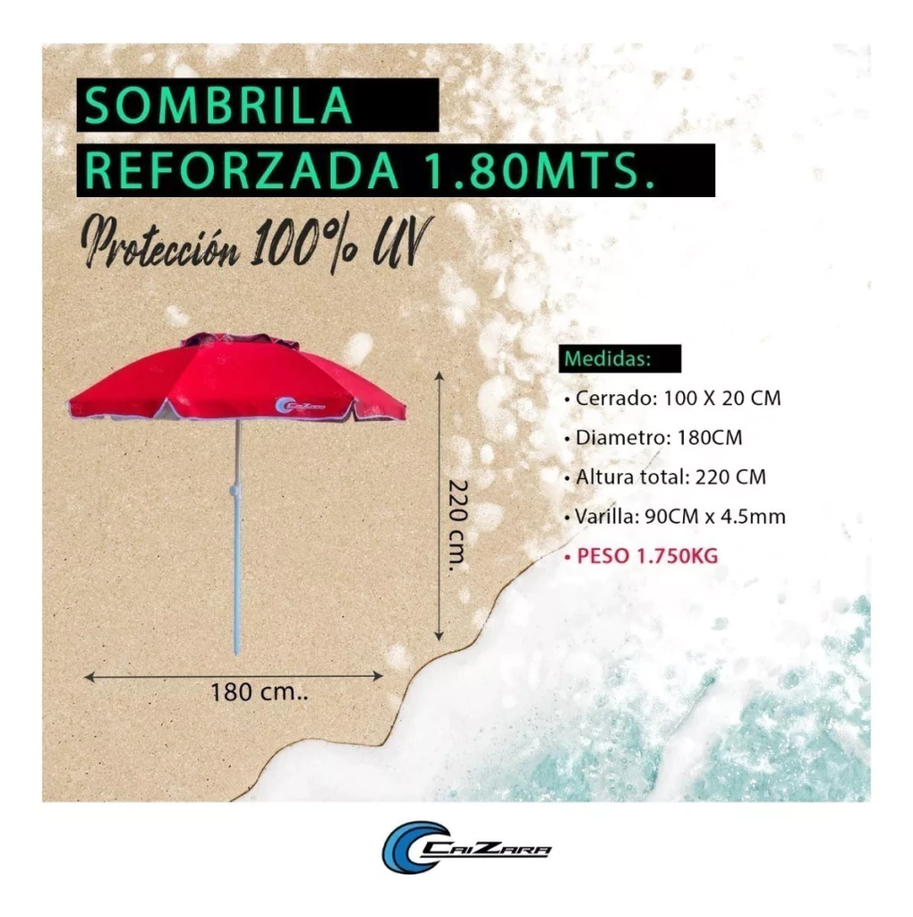 •Sombrilla playa super reforzada •Reclinable 2 mts de diámetro •Estructura metalica •Varillas de 4.5mm •Sistema de doble varilla (muy reforzada) •Bolso de transporte del mismo material que la sombrilla •Sistema de reclinacion de metal •Sistema de doble traba en palo inferior •Colores lisos y muy lindos - gris - azul - verde – roja •Caño 3.2 cm super reforzado •Tamaño cerrada en el bolso de transporte 110cm