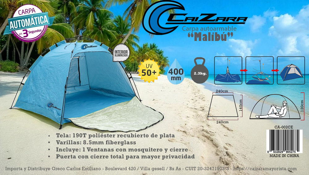 Otras Características: • Tela de poliéster 190T aluminizada con tratamiento UV • Piso en poliester doble laminado de 130 grs • 400mm de columna de agua • Incluye estacas • Bolsas de arena para estabilizar la estructura • Bolsa de Transporte con correa • Peso 2.3 KG
