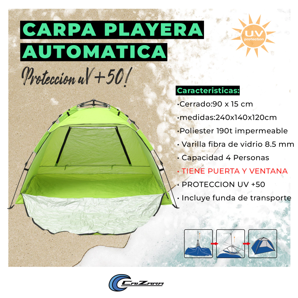 Características Principales: • Gran Tamaño • Sistema de apertura Automático • Se arma en menos de 1 minuto • INCLUYE VENTANA CON MOSQUITEROS PARA ESOS DIAS DE CALOR ITENSOS. • INCLUYE PUERTA PARA MAYOR PRIVACIDAD. • Varillas Macizas de alta calidad en 8.5mm • Bolso de Transporte espacioso => muy fácil de volver a guardar la carpa • Protección Solar UV • Ultra Liviana