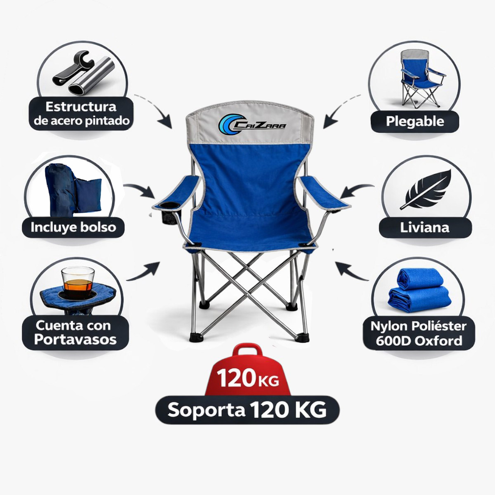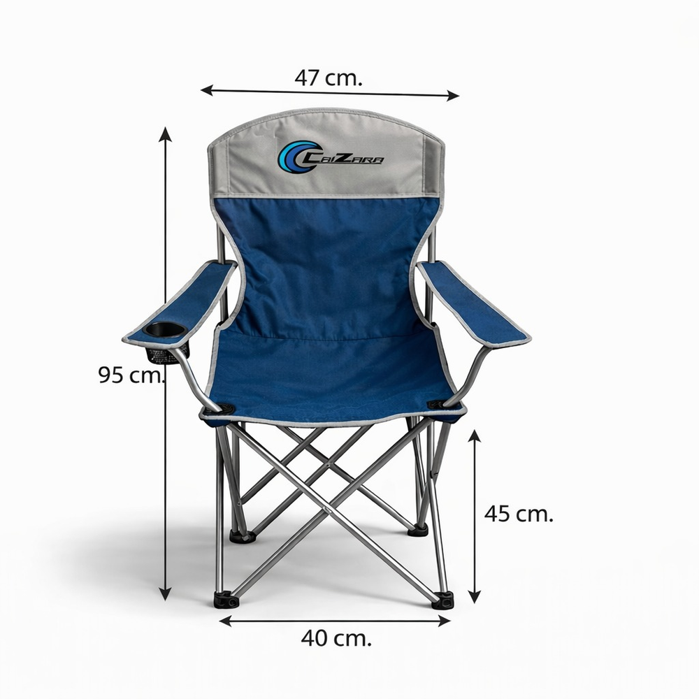 Sillón Director Plegable CAIZARA SD-1003 » Material: Nylon Poliéster 600D Oxford. » Medida: 52 x 52 x 40 / 96 cm » Capacidad de resistencia 120 kg » Estructura de aluminio con pintura epoxy. » Terminales y refuerzos en PVC reciclado. » Apoya brazos confortables con portavaso. » Costuras reforzadas en asiento y respaldar. » Funda de transporte