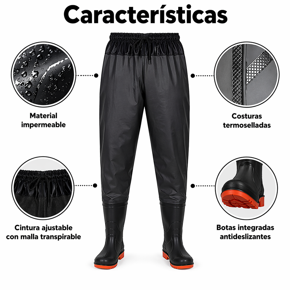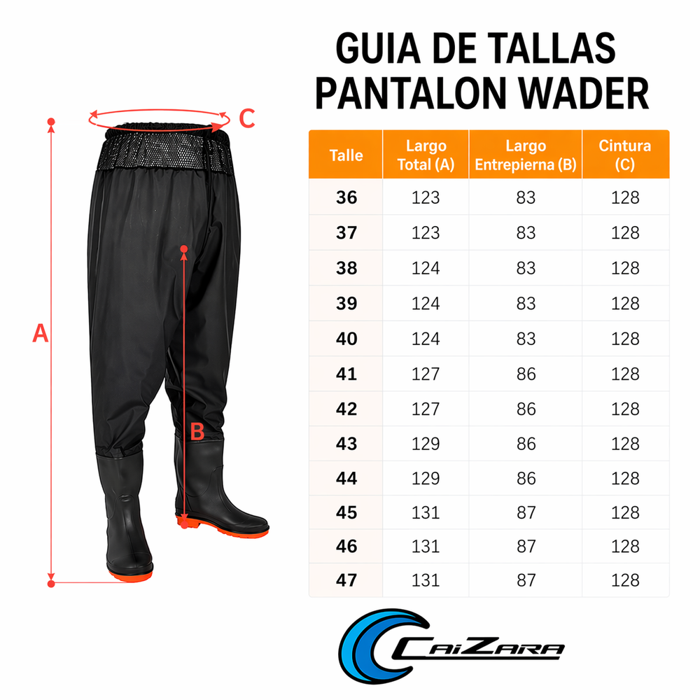 -Pantalon waders caizara . -Construido en pvc y goma . -Costuras soldadas totalmente impermeable. -Botas de goma selladas al pantalon muy comodas y flexibles -Uso: ideal para pesca en playa -rio - laguna mar y para la moto en dias de lluvia. -Cintura ajustable con tela respirable. Disponible el talles 40-41-42-43-44-45-46