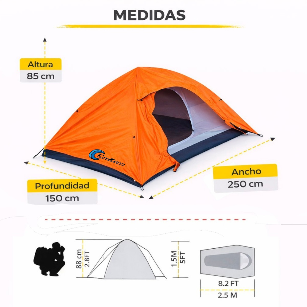 Materiales: Estructura: Varillas de NANO FIBER, Cubre techos: Fabricado en 100% poliéster, Dormitorio: Hecho de 100% poliéster respirable, Piso: Fabricado en poliéster Oxford de alta resistencia