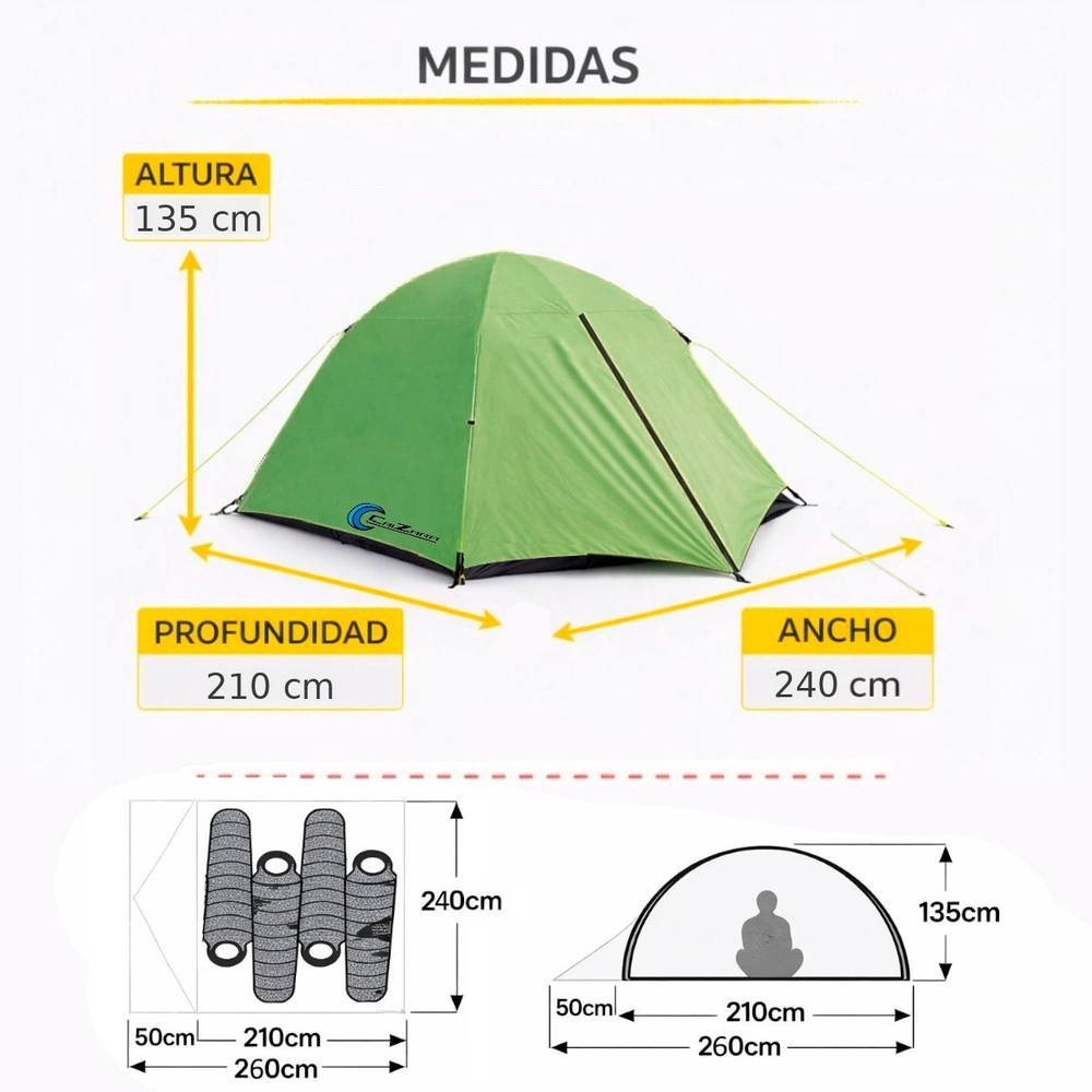 CARACTERISTICAS: -Capacidad: Diseñada para albergar hasta 4 personas, con suficiente espacio para todo tu equipamiento, garantizando un descanso reparador. -Impermeabilidad: Cuenta con una columna de agua de 3000 mm P.U., lo que asegura que te mantendrás seco incluso en condiciones de lluvia. -Estructura Resistente: Su estructura de fibra de vidrio de 8,5 mm proporciona durabilidad y resistencia ante vientos fuertes. -Mosquitero: Equipado con poly mesh no see um, que permite la circulación del aire mientras te protege de los insectos. -Costuras Reforzadas: Las costuras son termoselladas, lo que aumenta la impermeabilidad y la durabilidad de la carpa -Cubretecho Completo: El cubretecho llega hasta el piso, brindando una protección adicional contra la lluvia y el frío. -Accesibilidad: Con 1 entrada y 1 ábside, facilita el acceso y el almacenamiento de equipo. -Incluye: Tirantes para vientos y estacas para asegurar la carpa en el terreno. -Transporte: Viene con un bolso con correa de transporte, facilitando su traslado.