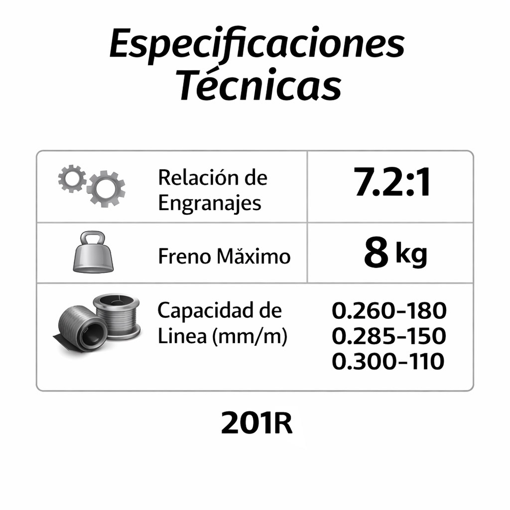 - Carretel: Aluminio anodizado\Peso: 210 g